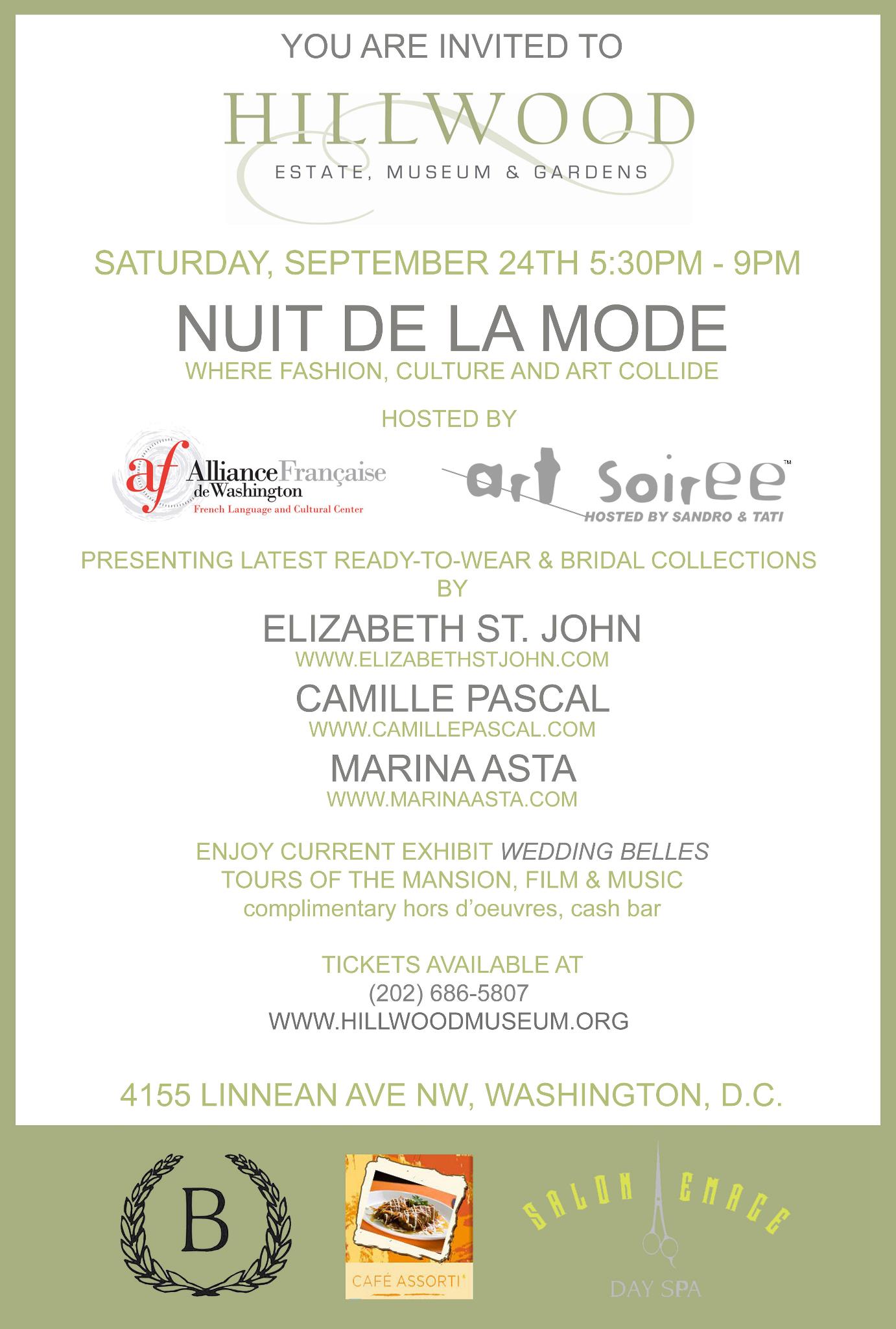 In September of 2011, I attended a free event for DC Fashion Week in the Dupont Circle area. Among the glamorous and fashionably inclined, I met the designer and the photographer for Elizabeth St John (whom I later interviewed here). After the introductions and chatting, they invited me to model in their showcase that weekend. I thought it sounded like a fun opportunity…so I agreed. That Saturday, from 2pm until around 9pm, I witnessed the exciting behind-the-scenes experience of being a part of a real fashion show. From hair and make-up, to dress fittings, to runway practicing, to mini dramas among the organizers, it was a fun-filled afternoon. The event took place at the Hillwood Estates, which includes a museum and lovely gardens. I must admit, once I entered the gates to the estate, I felt as if I was transported to southern France. It really was beautiful. The models I met at the show were also welcoming. Once they found out that this event was my first modeling experience, they immediately extended a fashionable-helping-hand and gave me advice on how to get ready and which business cards I should pick up. We also had fun practicing power-walking on the cobble-stone runway. I ended up modeling for all three designers at this event and met some wonderful people.